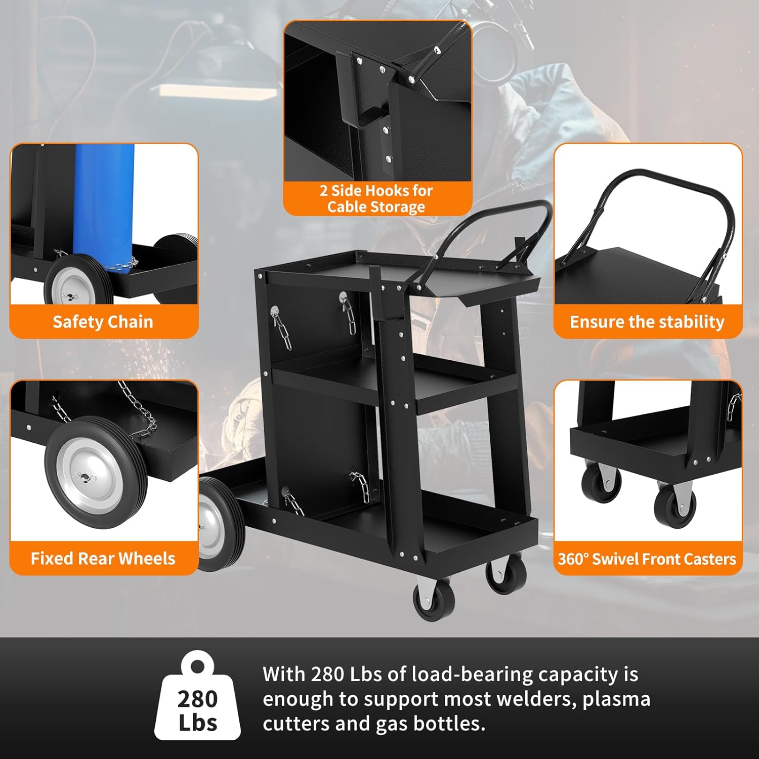 The Ocforiya Welding Cart is a heavy-duty, rolling welding cart. It has a 280lbs capacity. The cart is designed for various welding equipment. This includes MIG, TIG, and ARC welders, as well as plasma cutters. It features upgraded wheels for easy mobility. It also includes safety chains to secure equipment.