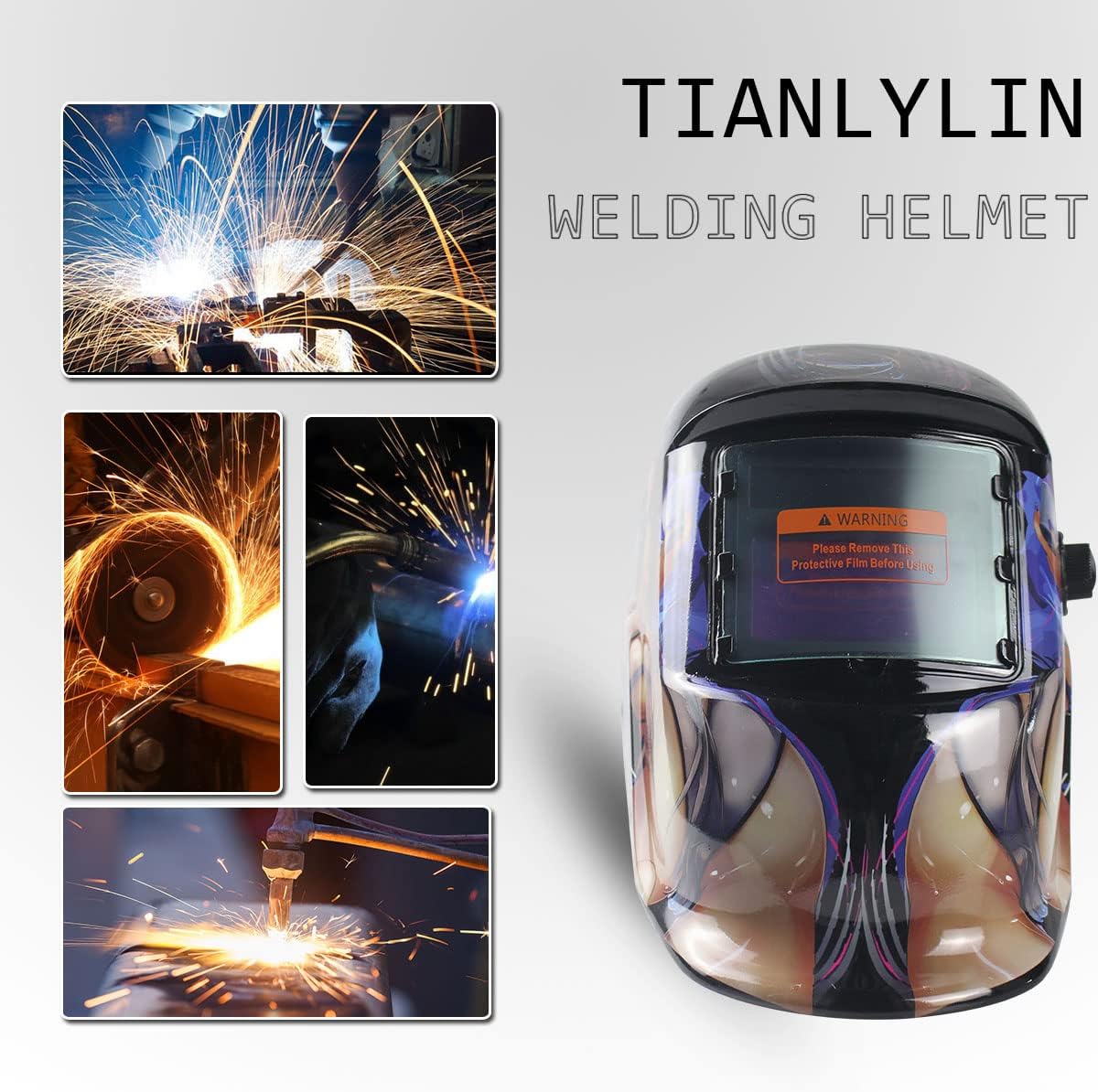 This image shows a TIANLYLIN solar-powered welding helmet. The helmet features an automatic dimming function. It is designed for welding and provides eye protection. The product description highlights three key features. These features are solar charging, adjustable settings, and adjustable sensitivity and delay. A warning sticker on the visor instructs the user to remove the protective film before use. The helmet has a unique graphic design on its exterior.