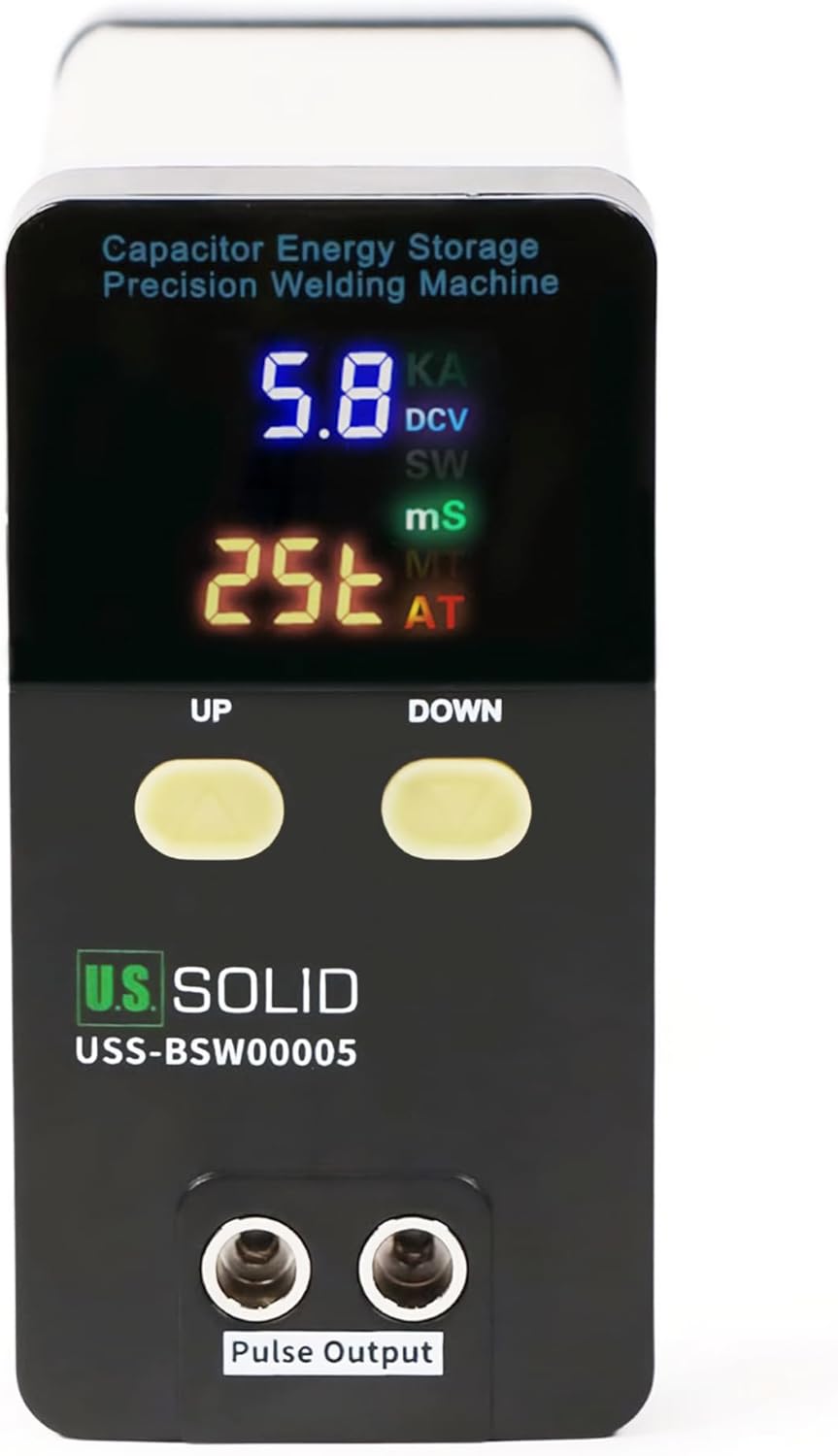 This image shows a U.S. Solid Capacitor Energy Storage Precision Welding Machine, specifically the USS-BSW00005 model. It’s a small, rectangular device with a two-tone design, featuring a black front and a metallic silver body. The front panel has a digital display showing numerical values like 5.8 KA and 25.1 mS, which likely correspond to the welding current and pulse duration. Below the screen, there are ‘UP’ and ‘DOWN’ buttons for adjustments. At the bottom, there are two ‘Pulse Output’ ports. The device is labeled with a ‘WARRANTY VOID IF SEAL IS BROKEN’ sticker, emphasizing its sealed nature.